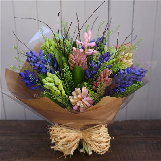 15 stems of highly scented Hyacinths with complimenting foliage and twigs.