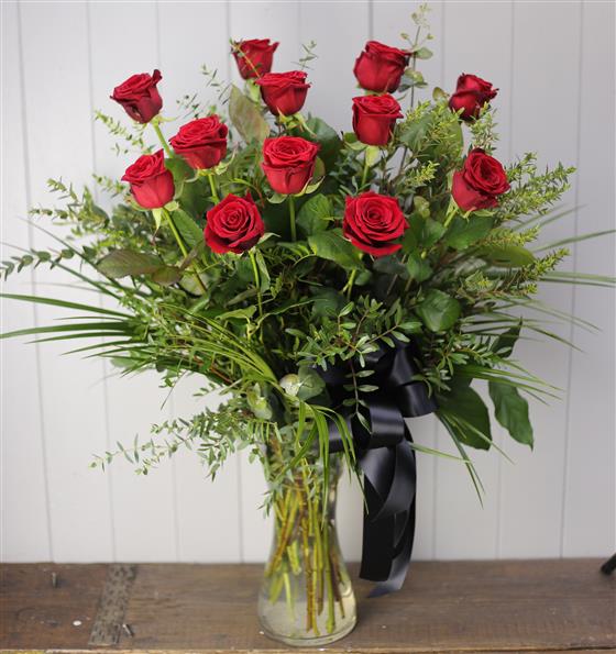 A dozen beautiful fresh 70cm Red Naomi Roses, the best large headed long stemmed roses the flower markets offer hand tied with seasonal foliages.