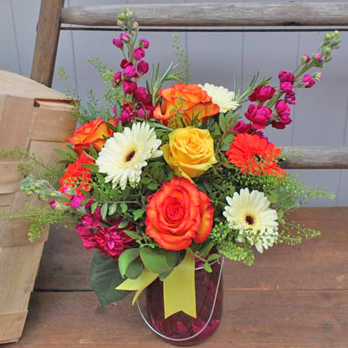 Fun & funky, gerberas, stocks, roses and thlaspi arranged in a vintage style glass jar.